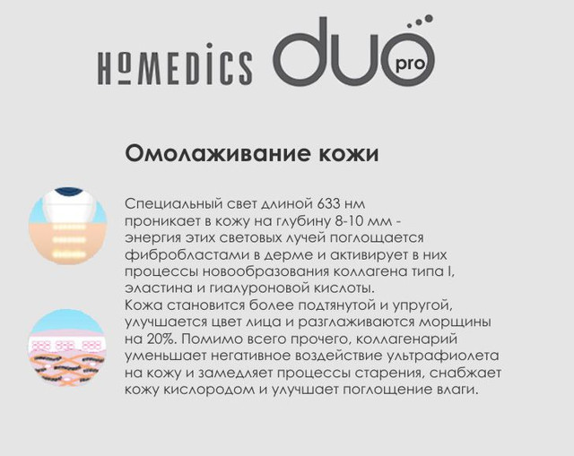 Коллагенарий это насадка для эпилятора Homedics DUO Pro, стимулирующее выработку в кожном покрове коллагена. Коллагеновая лампу вырабатывает красно-розовый свет. Содержащиеся в коже фибропласты поглощают энергию света и стимулируют процессы образования белков – коллагена и эластина, а также гиалуроновой кислоты, поддерживающих молодость кожи. В результате происходит восстановление кожного слоя и улучшается его структура: