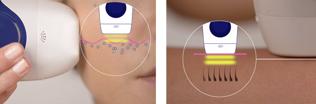 При цьому виробляється лікувальний ефект, що проявляється у прискоренні процесів метаболізму та зникненні пігментних плям та капілярів. Застосування змінної насадки-колагенарію дозволяє поєднувати депіляцію з покращенням стану шкіри.