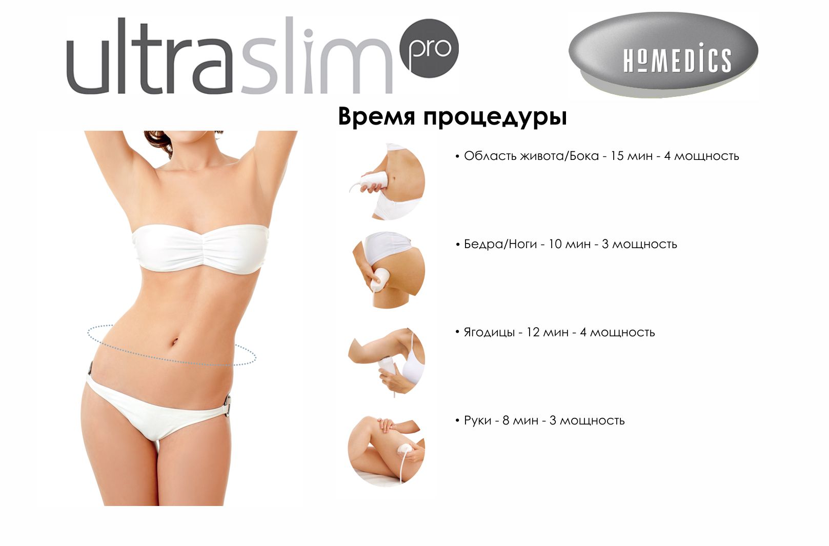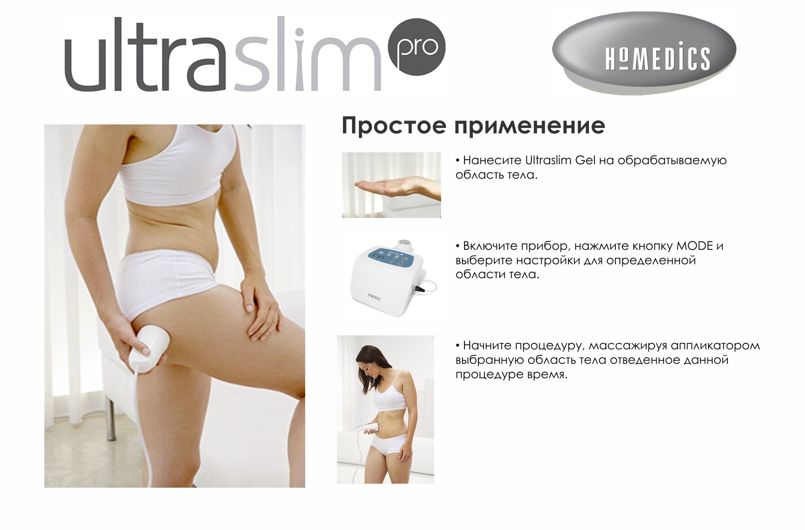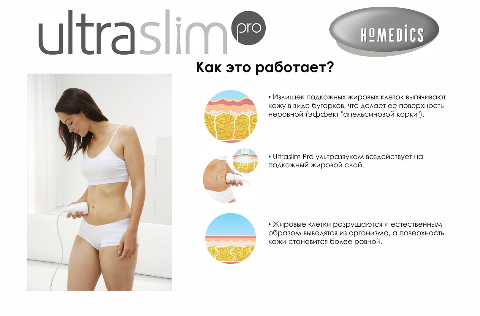 HoMedics UltraSlim Pro — это новая разработка ультразвукового прибора для похудения методом кавитации. Его работа основана на способности ультразвуковых волн с частотой 40 кГц разрушать клеточные мембраны жировой ткани. Прибор позволит уменьшить объёмы тела и избавит от целлюлита, не используя оперативного и медикаментозного вмешательства.